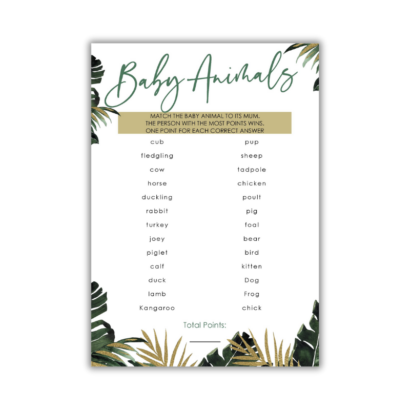 Our Baby Animals custom shower game is a wild and wonderful way to entertain guests while celebrating the mama-to-be. Think “foal”, “joey”, “pup” — do your guests know which baby belongs to which animal?