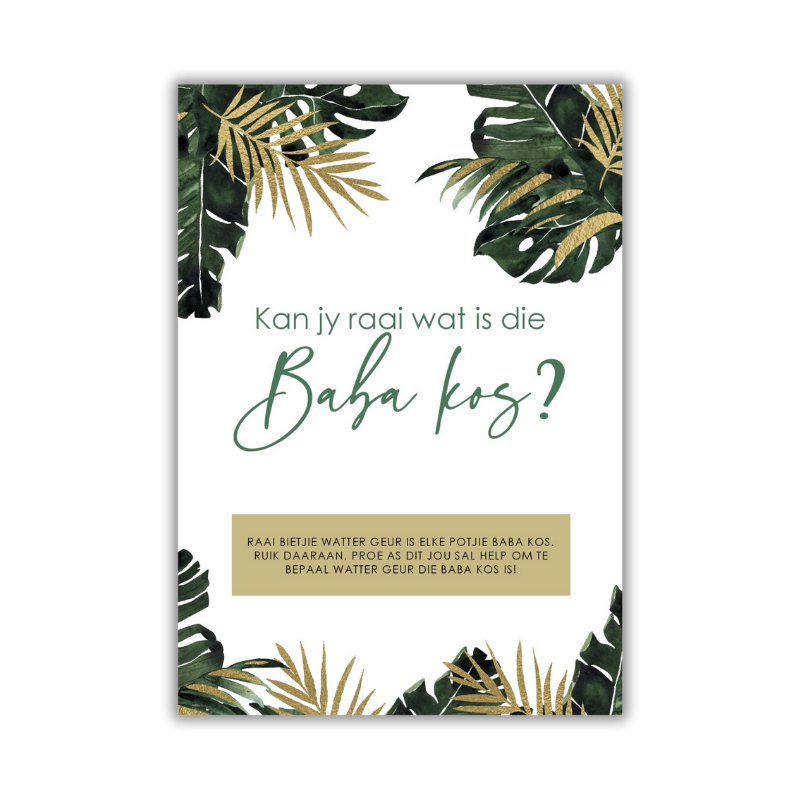 Here’s how it works: Select your baby food jars (at least 5 flavours), spoon them into numbered containers, and let guests taste and guess! Feel free to order a matching answer sheet too. Available in Afrikaans or English, and we can send you a PDF to print at home, or we can do the printing for you!