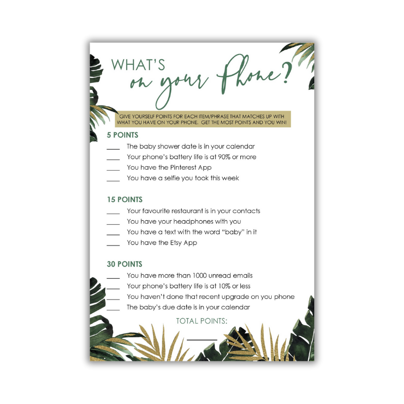 It’s time to find out who’s got the quirkiest, funniest, or most unexpected stuff on their phone! “What’s On Your Phone” is a trendy baby shower game where guests check their phones for items on a list — from baby emojis to pregnancy apps — and earn points for each item they have.