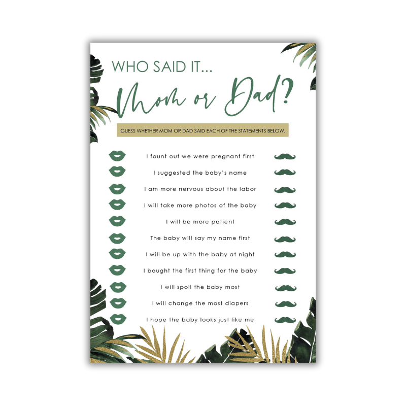 Who Said It – Mom or Dad? is the perfect icebreaker game that gets everyone talking (and giggling). We ask the parents-to-be some fun, sweet, or silly questions ahead of time – and then guests try to guess who said what. “Who’s more likely to change nappies at 2am?” “Who was the pickier baby?” “Who cried at the baby scan?” Let the battle of the parents begin!