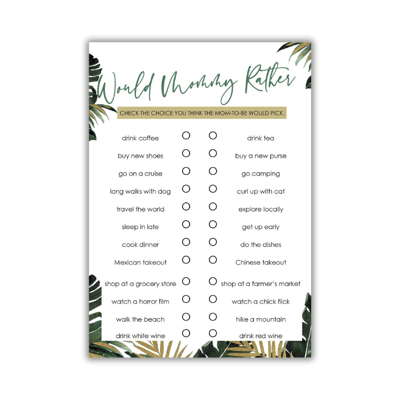 Dive into the fun world of “Would Mommy Rather” — a baby shower game that lets guests guess mommy-to-be’s preferences between two hilarious or tricky baby-related choices. Whether it’s “drink coffee or tea?” or “dishes or make food?”, this game sparks fun conversations and reveals what mom-to-be really thinks!