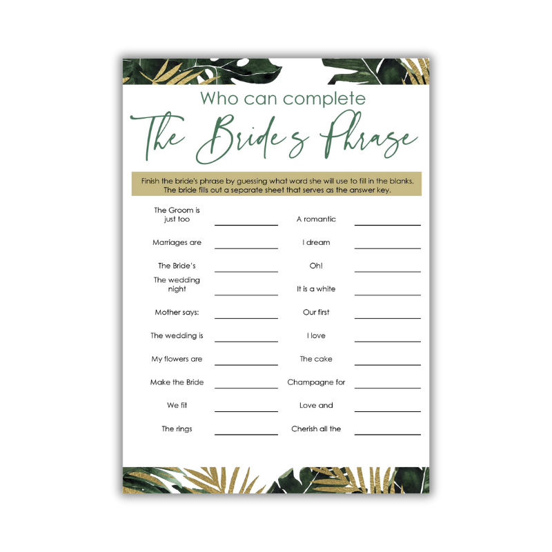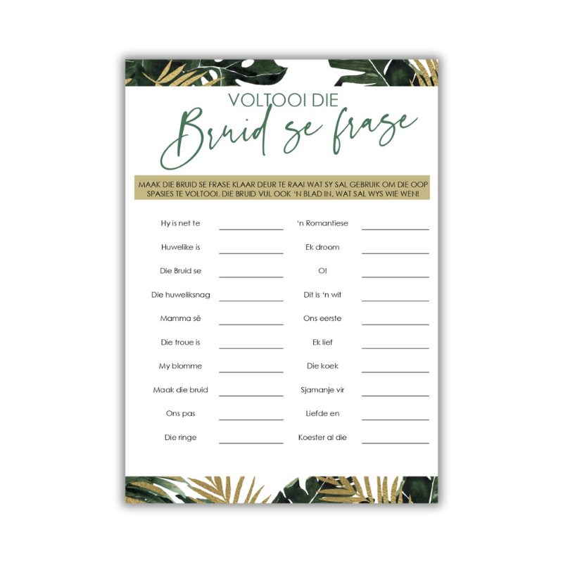 “Who Can Complete the Bride’s Phrase?” is the perfect bridal shower game to see who knows the bride best and who has the most creative sense of humor! In this fun, interactive game, the bride will start a sentence about her love life, wedding day, or any personal preference, and the guests will have to finish the sentence. Some guests might give funny, sweet, or even completely outrageous responses, which makes this game full of laughter and surprises! After each round, the bride will reveal what her real answer was, and the guest who got closest wins a prize. We will customize the game cards with phrases and designs that match your bridal shower’s theme and color scheme, so it seamlessly fits into your celebration. Available in Afrikaans and English, you can opt for a PDF to print at home, or let us handle all the printing for you! “Who Can Complete the Bride’s Phrase?” is a fun and personal game that will bring joy and laughter to your bridal shower.
