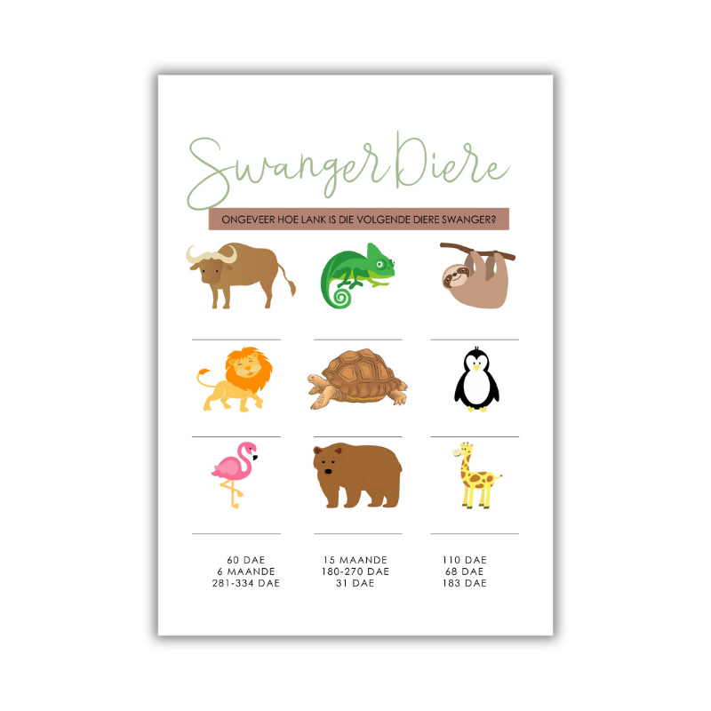 Get ready to giggle, guess, and go “aww!” with this heartwarming “Pregnant Animals” Baby Shower Game – lovingly designed in soothing brown and green hues to match any nature-inspired baby shower.