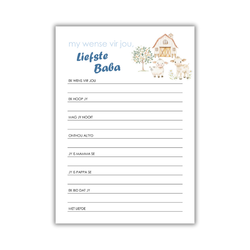 This A5 printable is beautifully designed with gentle pastels, soft textures, and the cutest little farm animals to melt every guest’s heart. Guests fill in heartfelt wishes for the new baby, from “I hope you learn…” to “I hope you love…” — creating a precious keepsake that parents will cherish forever.