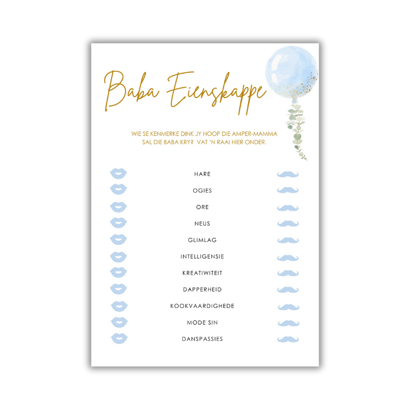 Designed in a dreamy blue & gold palette, this printable features a soft watercolor balloon and a delicate eucalyptus leaves for a fresh and elegant feel. Perfect for boy baby showers, neutral themes, or modern celebrations with a touch of class.