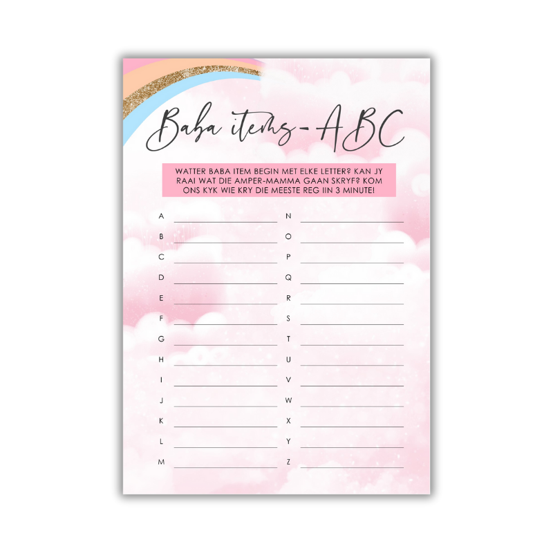 Featuring a charming pink cloud background, soft pastel rainbows, and shimmery gold glitter accents, this game is as gorgeous as it is entertaining. It’s the perfect fit for girl baby showers, rainbow baby themes, or anything dreamy and sparkly.