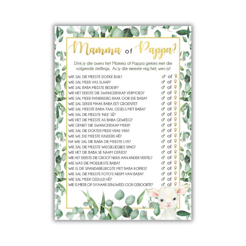 Designed in a serene eucalyptus green palette with gold accents and the cutest lamb illustration, this game blends beautifully with neutral, rustic, or modern boho baby shower themes.
