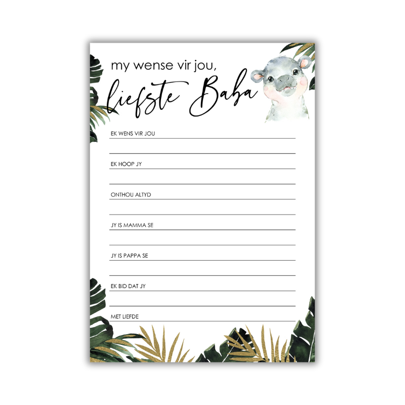 Celebrate the wild adventure ahead with this “My Wishes for Little Baby” game! Featuring soft green leaves and the cutest safari baby hippo, this A5 printable is an instant download—perfect for your baby shower. Preloved and eco-friendly, just pay with YOCO and it’s yours in seconds!