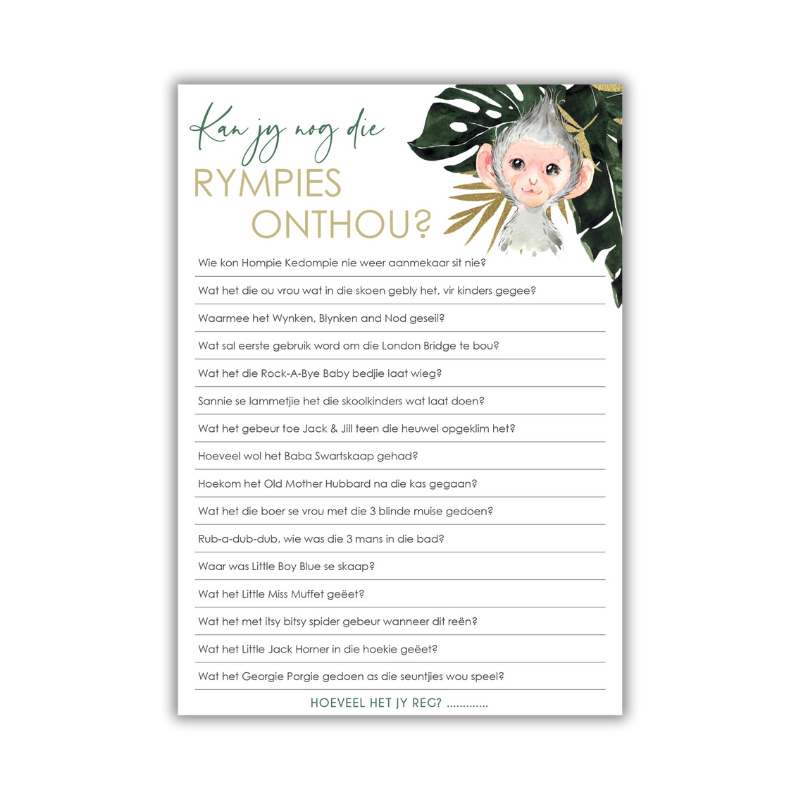 Let your guests go bananas with this playful Nursery Rhymes Baby Shower Game! It’s a simple and entertaining activity where everyone fills in the missing words or completes classic nursery rhymes. A perfect mix of nostalgia, laughter, and brain-teasing fun.