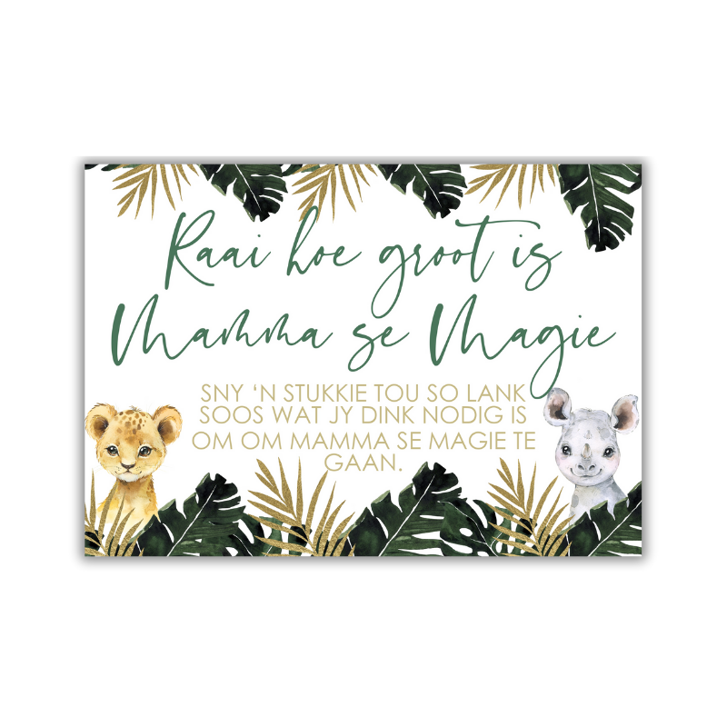 It’s guessing time in the jungle! This adorable Mommy’s Belly Game is a classic baby shower favourite with a wild twist. Guests try to guess the size of the mom-to-be’s belly – using string, paper, or just their best instincts!