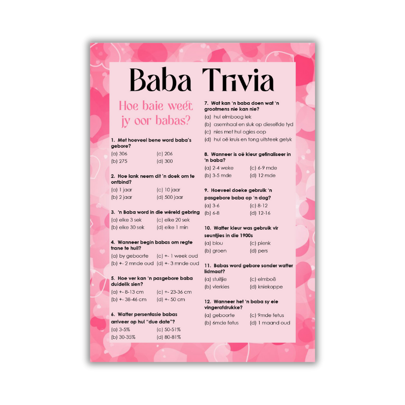 How much do your guests really know about babies? Put their baby smarts to the test with this adorable Baby Trivia game – the perfect mix of fun facts, surprises, and a little friendly competition!