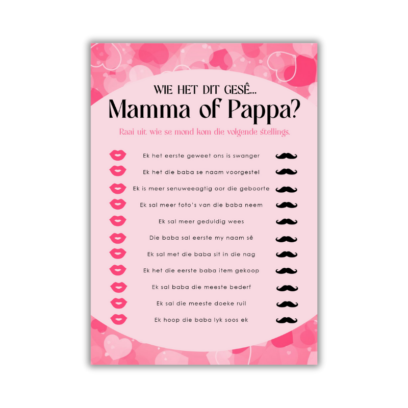 Who said it – Mommy or Daddy? Download this fun guessing game in a pink hearts theme. A5 printable – instant download after YOCO payment!