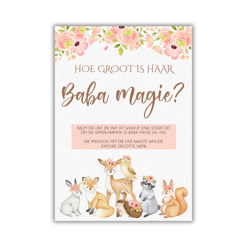 This preloved A5 baby shower game brings laughter, love, and a touch of nature to your special celebration. Designed with soft pink florals and the sweetest woodland animals – think foxes, bunnies, and baby deer – it sets the scene for a magical day.