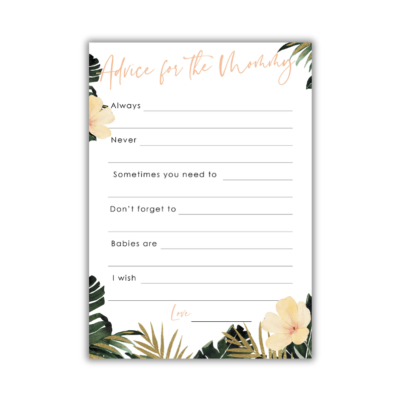 Planning a preloved baby shower with charm, laughter, and heart? Our Advice for Mommy printable game is the perfect way to sprinkle encouragement and love onto the guest of honour. Designed with soft yellow florals and lush tropical greenery, this A5-sized printable brings calm island vibes to your celebration.