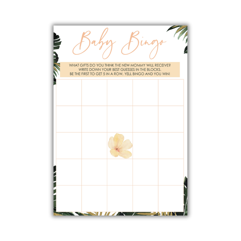 Say aloha to baby shower fun with our Tropical Leaf & Soft Yellow Floral Baby Bingo game!