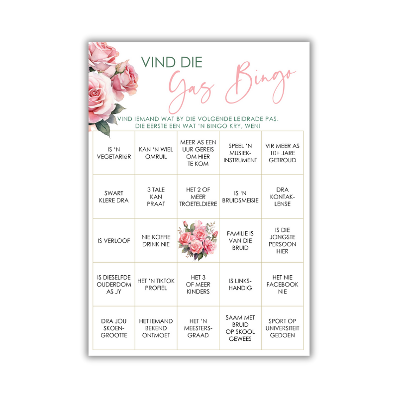 Break the ice in style with “Find the Guest Bingo” — a fun and floral bridal shower game featuring soft pink roses. Preloved & instantly downloadable via YOCO!